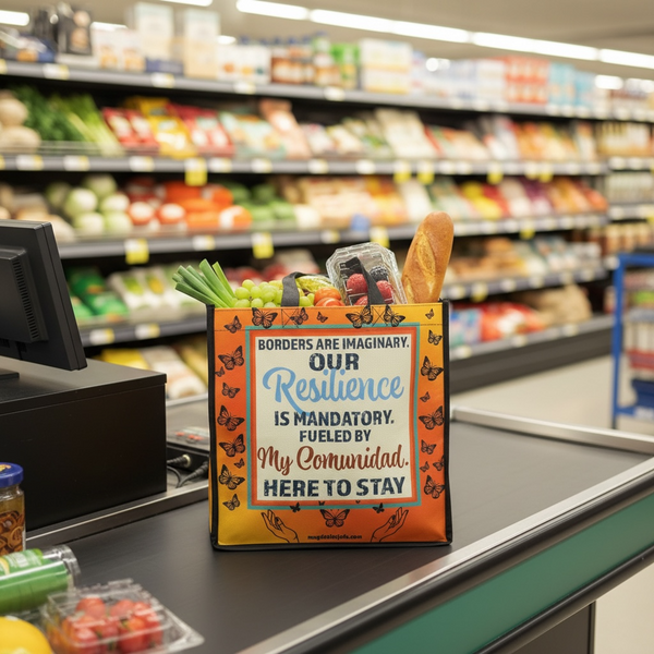 • Bilingual Messaging: Features the phrase: "Borders are imaginary. Our resilience is mandatory. Fueled by My Comunidad. Here to stay."